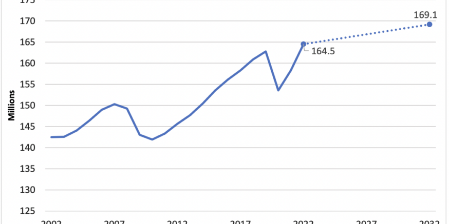 EMPLOYMENT PROJECTIONS — 2022−2032 The U.S. economy is projected to add almost 4.7 million jobs from 2022 to 2032, the U.S. Bureau of Labor Statistics (BLS) reported today. Total employment is projected to increase to 169.1 million and grow 0.3 percent annually, which is slower than the 1.2-percent annual growth recorded over the 2012−22 decade.…
